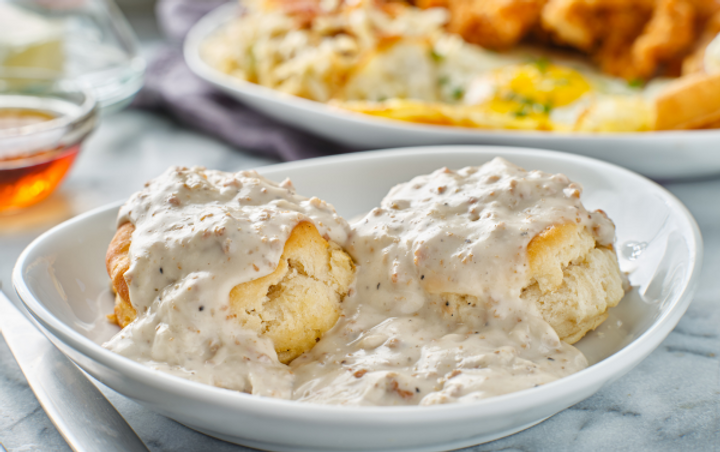 Split the cooled biscuits in half, then ladle about 1/3 cup of the gravy over the open biscuit halves. This stick-to-your-bones dish pairs perfectly with breakfast favorites, such as bacon and eggs.